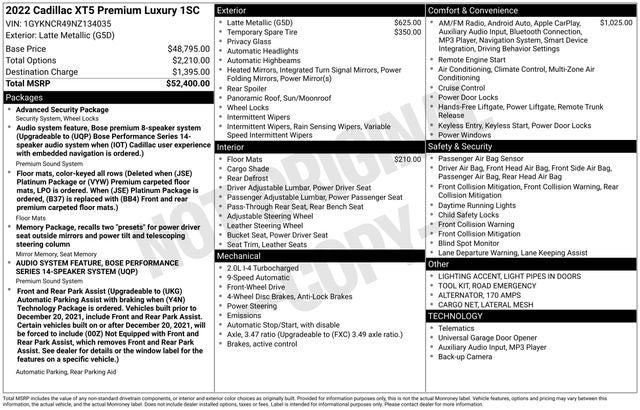 170 Amp Alternator, 2-Way Power Driver Lumbar Control Seat Adjuster, 2-Way Power Passenger Lumbar Control Seat Adjuster, 3.47 Axle Ratio, 4-Wheel Disc Brakes, 4-Wheel Independent Suspension, 8 Speakers, ABS brakes, Air Conditioning, All-Weather Floor Mats, Alloy wheels, AM/FM radio: SiriusXM, Apple CarPlay/Android Auto, Audio memory, Auto High-beam Headlights, Auto-dimming door mirrors, Auto-dimming Rear-View mirror, Automatic Dual-Zone Climate Control, Automatic Emergency Braking, Automatic Stop/Start w/Disable, Automatic temperature control, Bodyside moldings, Bose Performance Series 14 Speakers System, Bose Premium 8-Speaker Audio System Feature, Brake assist, Bumpers: body-color, Compass, Delay-off headlights, Driver door bin, Driver vanity mirror, Dual Driver Info Center Display Gauge Cluster, Dual front impact airbags, Dual front side impact airbags, Electronic Stability Control, Emergency communication system: OnStar and Cadillac connected services capable, Four wheel independent suspension, Front & Rear Park Assist, Front anti-roll bar, Front Bucket Seats, Front Center Armrest, Front dual zone A/C, Front reading lights, Fully automatic headlights, Garage door transmitter, HD Rear Vision Camera, Heated door mirrors, Heated Driver & Front Passenger Seats, Heated front seats, Heated steering wheel, Illuminated entry, Inside Rear-View Auto-Dimming Mirror, Knee airbag, Lateral Mesh Cargo Net, Leather Seating Surfaces w/Mini Perforated Inserts, Leather steering wheel, Light Pipes in Doors Lighting Accent, Low tire pressure warning, Memory seat, Occupant sensing airbag, Outside temperature display, Overhead airbag, Overhead console, Panic alarm, Passenger door bin, Passenger vanity mirror, Power door mirrors, Power driver seat, Power Liftgate, Power moonroof: UltraView, Power passenger seat, Power steering, Power windows, Premium Luxury Package 1SC, Radio data system, Radio: Cadillac User Experience AM/FM Stereo, Radio: Cadillac User Experience w/Embedded Nav, Rain sensing wipers, Rear anti-roll bar, Rear reading lights, Rear seat center armrest, Rear window defroster, Rear window wiper, Remote keyless entry, Road Emergency Tool Kit, Security system, SiriusXM w/360L, Speed control, Speed-sensing steering, Split folding rear seat, Spoiler, Steering wheel memory, Steering wheel mounted audio controls, Tachometer, Teen Driver, Telescoping steering wheel, Tilt steering wheel, Traction control, Trip computer, Turn signal indicator mirrors, Variably intermittent wipers, Voltmeter, Wheels: 18 6-Split Spoke Alloy. Priced below KBB Fair Purchase Price! 22/29 City/Highway MPG